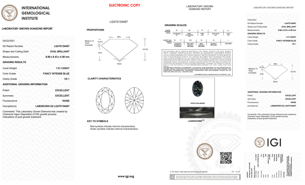 This Certified 1.51 Carat 8.89 x 6.43 x 4.08 mm Blue Oval Lab Grown Diamond has been hand selected by our GIA-certified gemologists for its exceptional characteristics and rarity.