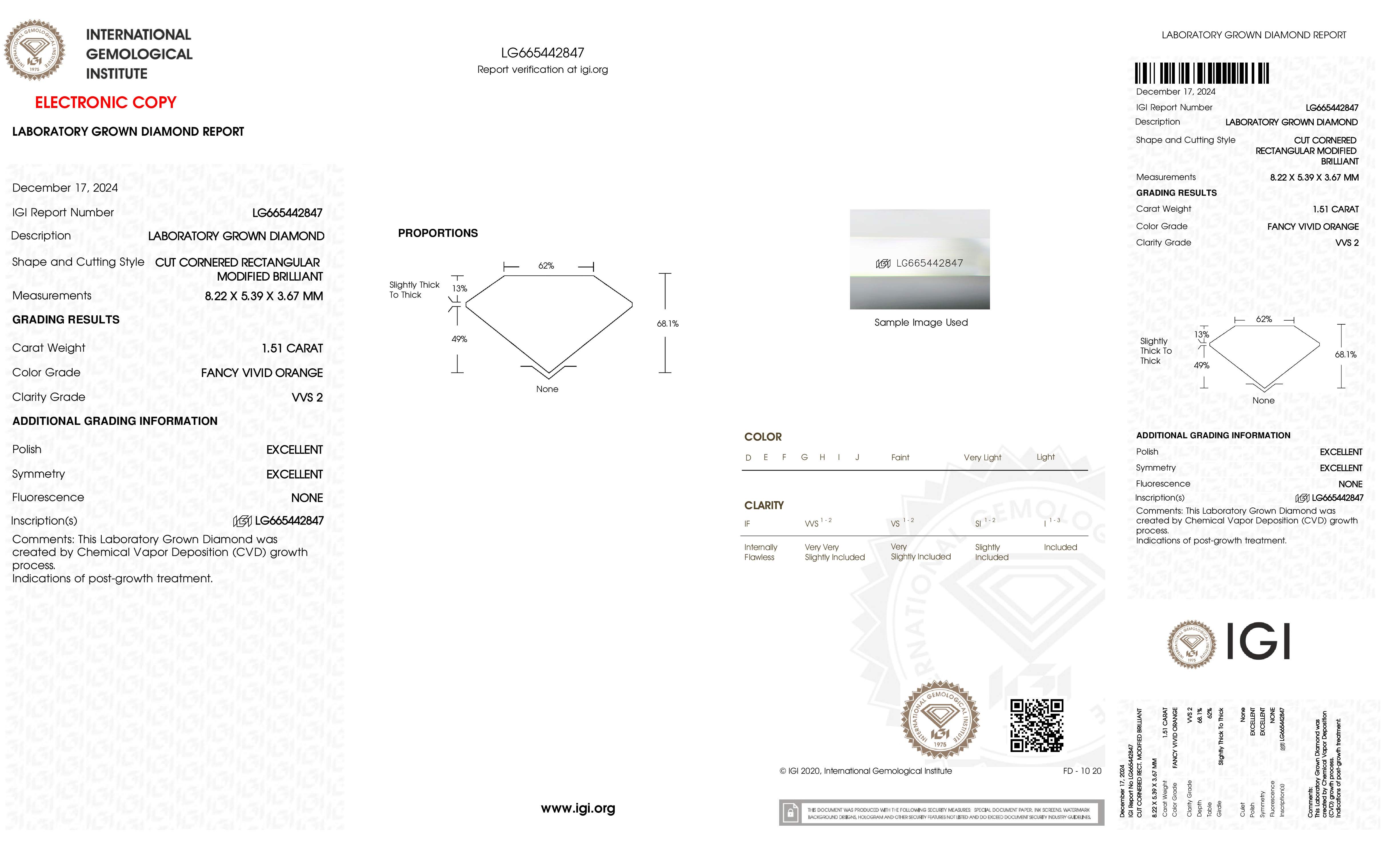 This Certified 1.51 Carat 8.22 x 5.39 x 3.67 mm Orange Radiant Lab Grown Diamond has been hand selected by our GIA-certified gemologists for its exceptional characteristics and rarity.