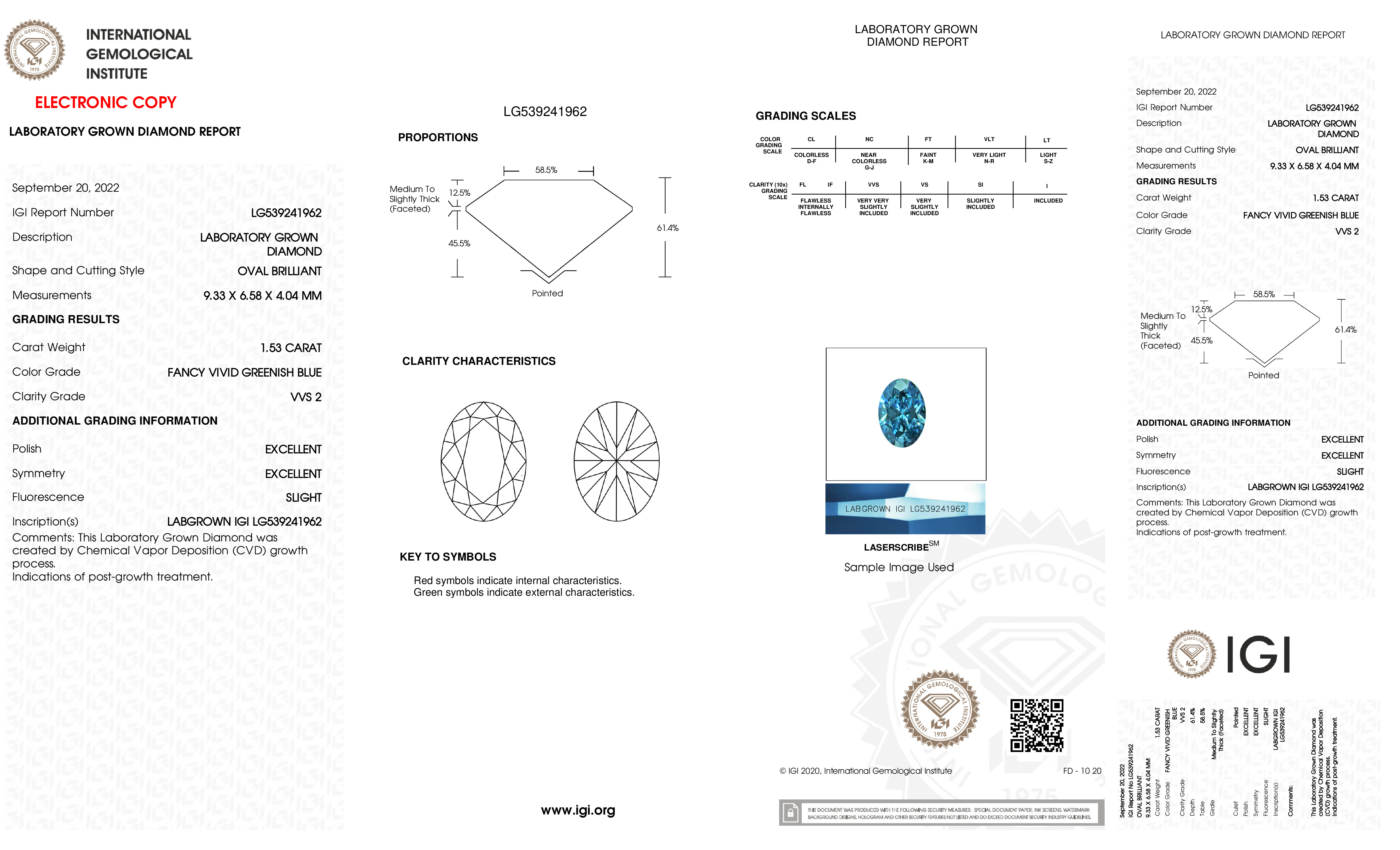 1.53 Ct. Fancy Vivid Greenish Blue Oval Lab Grown Diamond