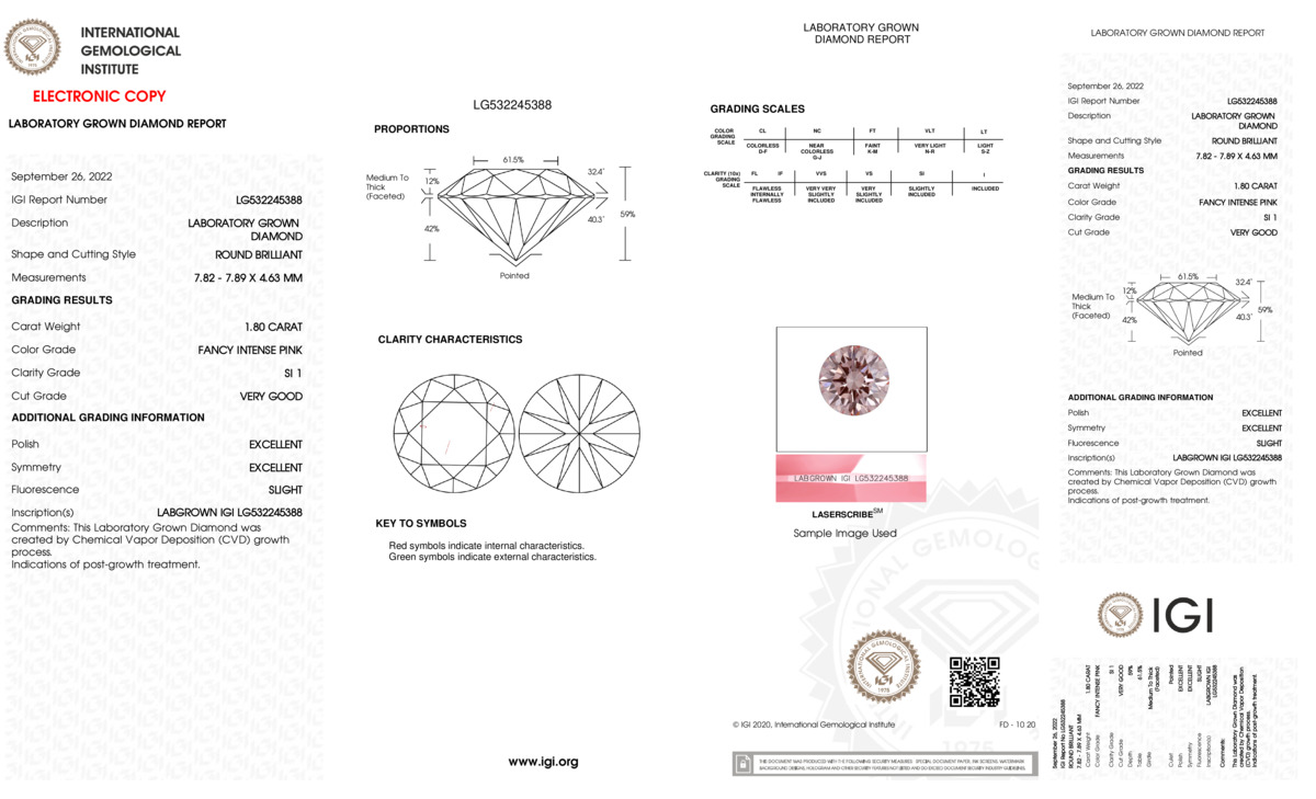 This Certified 1.8 Carat 7.89 x 7.82 x 4.63 mm Pink Round Lab Grown Diamond has been hand selected by our GIA-certified gemologists for its exceptional characteristics and rarity.