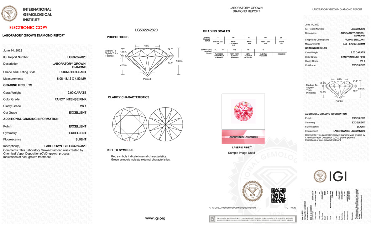 This Certified 2.0 Carat 8.12 x 8.08 x 4.83 mm Pink Round Lab Grown Diamond has been hand selected by our GIA-certified gemologists for its exceptional characteristics and rarity.