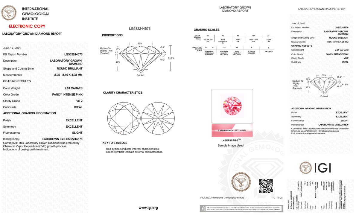 This Certified 2.01 Carat 8.10 x 8.05 x 4.98 mm Pink Round Lab Grown Diamond has been hand selected by our GIA-certified gemologists for its exceptional characteristics and rarity.