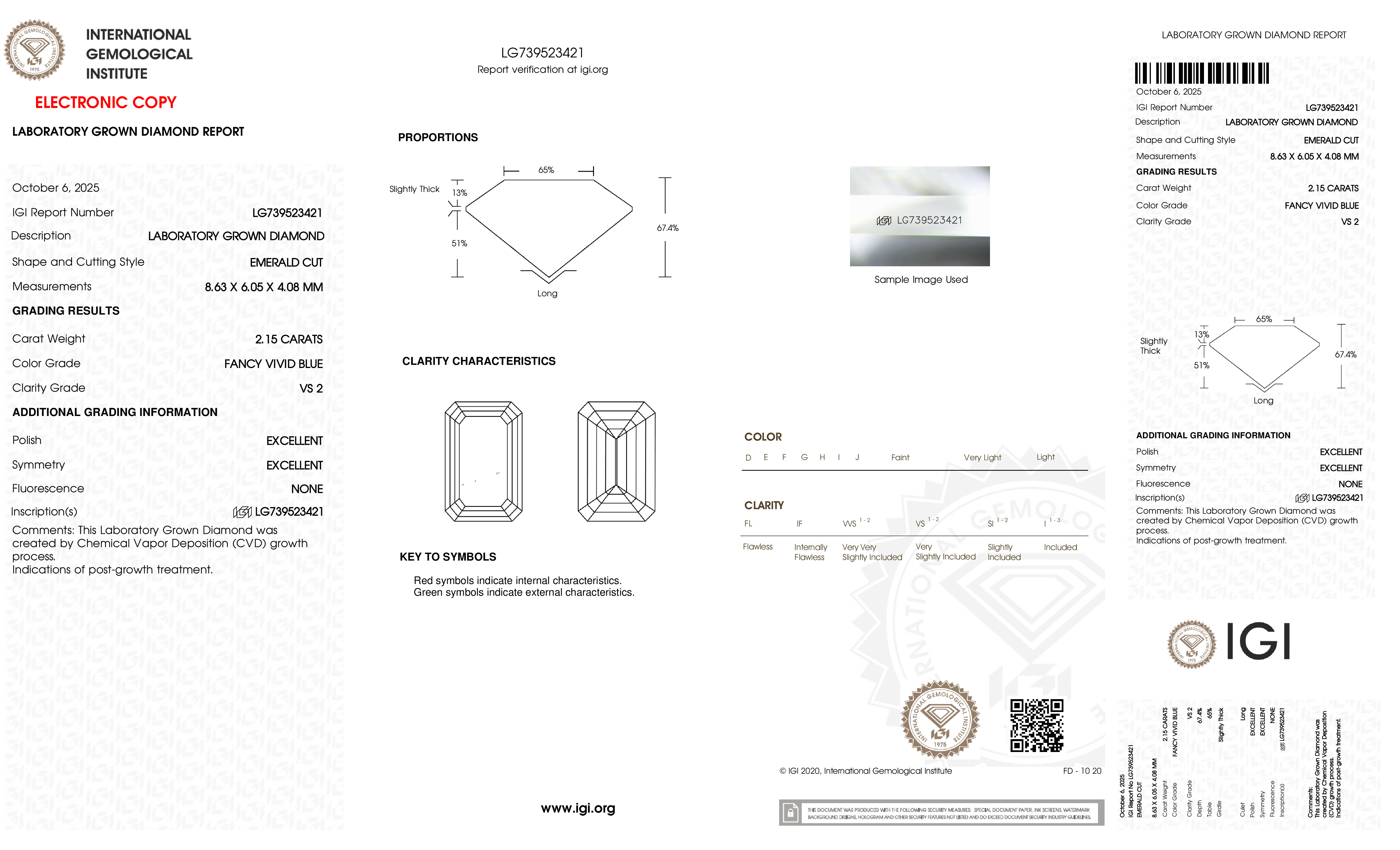 This Certified 2.15 Carat 8.63 x 6.05 x 4.08 mm Blue Emerald Lab Grown Diamond has been hand selected by our GIA-certified gemologists for its exceptional characteristics and rarity.