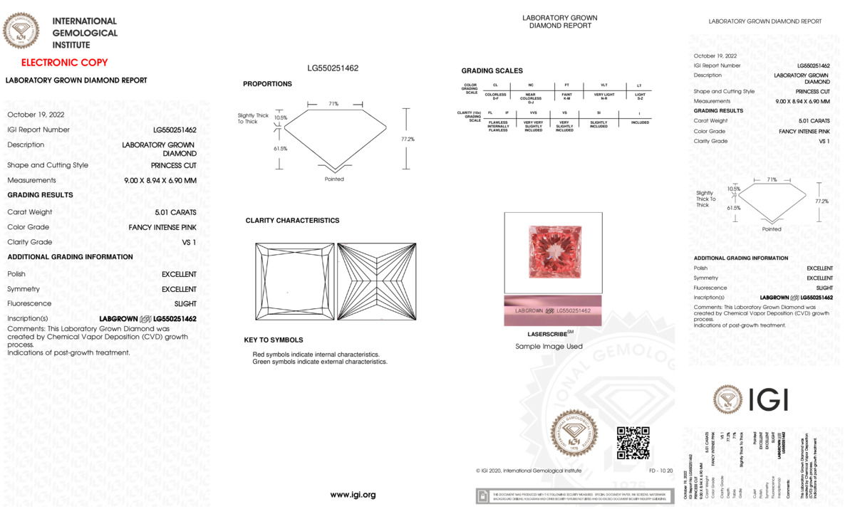 This Certified 5.01 Carat 9.00 x 8.94 x 6.90 mm Pink Princess Lab Grown Diamond has been hand selected by our GIA-certified gemologists for its exceptional characteristics and rarity.