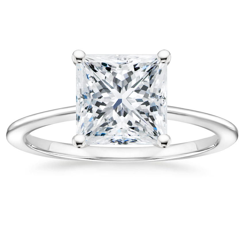 My fiancée wanted something timeless and understated. This ring is exactly that. The band is dainty but strong and the prongs are classically understated. My Aimee is platinum with a 1.66 carat for reference.