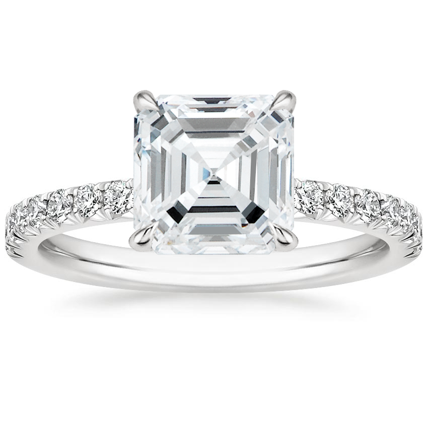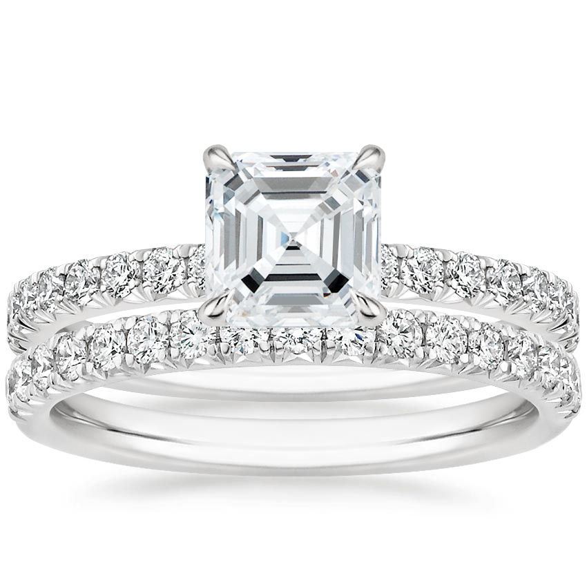This exquisite bridal set secures the center gem with elegant claw prongs and features French pavé set diamonds. The style allows light to reach the gems from multiple angles to amplify their sparkle (5/8 total carat weight). ... Read More