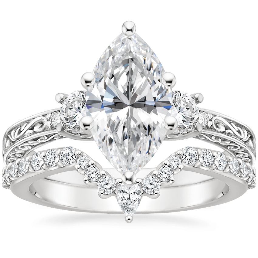 18K White Gold Antique Scroll Three Stone Trellis Lab Diamond Ring (1/3 ct. tw.) with Luxe Lunette Diamond Ring (1/3 ct. tw.) with 2.06 Carat Marquise Lab Grown Diamond