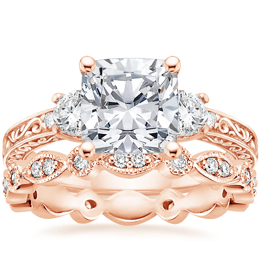 Antique Scroll Three Stone Trellis Diamond Ring (1/3 ct. tw.) with Tiara Eternity Diamond Ring (1/4 ct. tw.) in 14K Rose Gold