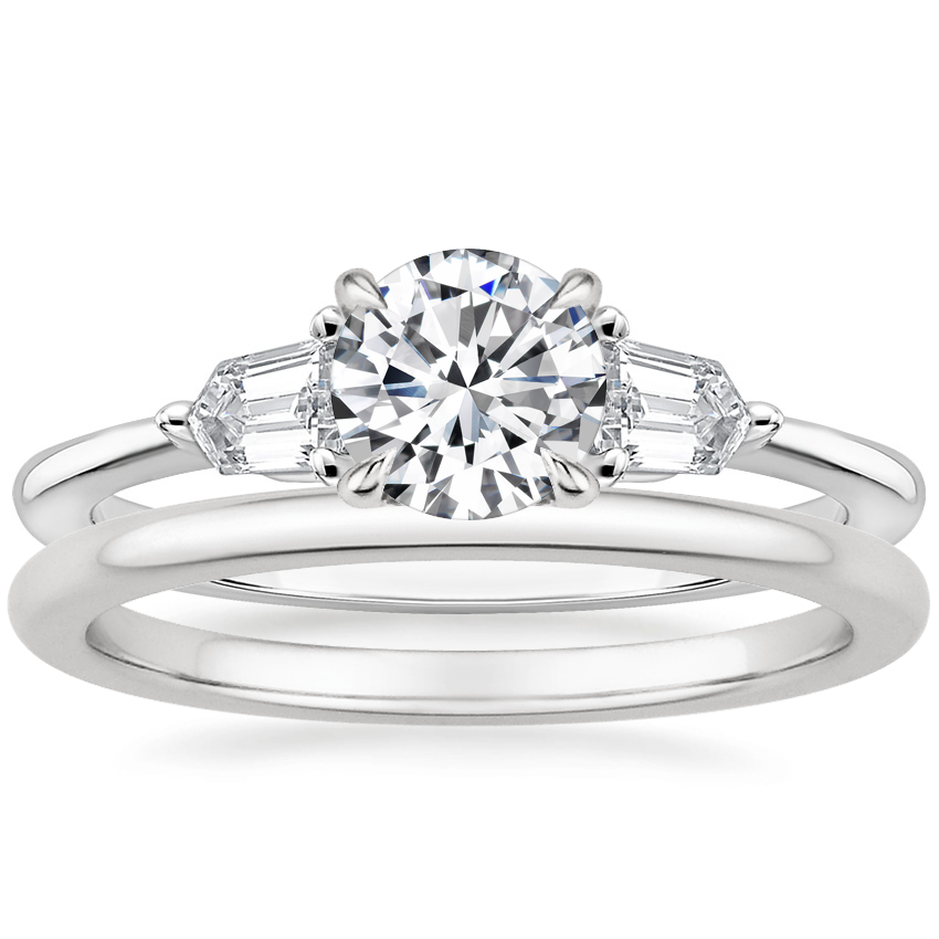 18K White Gold Bullet Shape Three Stone Diamond Ring with Petite Comfort Fit Wedding Ring