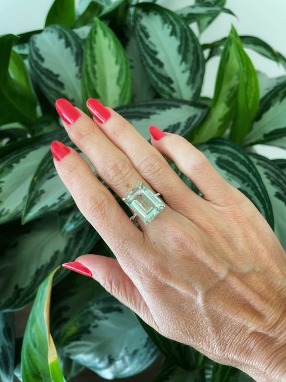 A prasiolite takes center stage in this cocktail ring while a diamond accented band, gallery, and prongs add extra glitz and glamour, creating a look reminiscent of spritely spring festivities (3/8 total diamond carat weight).