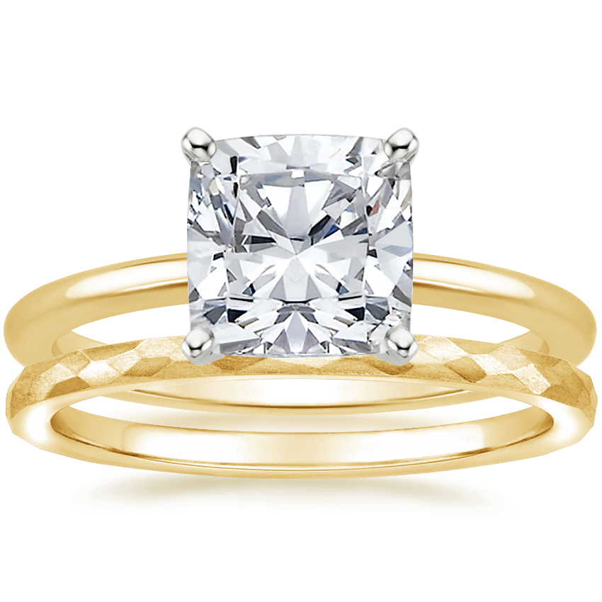 18K Yellow Gold Four-Prong Petite Comfort Fit Ring with Matte Hammered Petite Comfort Fit Wedding Ring