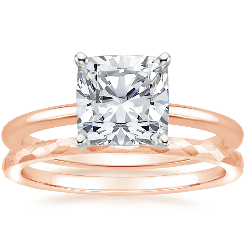 Four-Prong Petite Comfort Fit Ring with Matte Hammered Petite Comfort Fit Wedding Ring in 14K Rose Gold