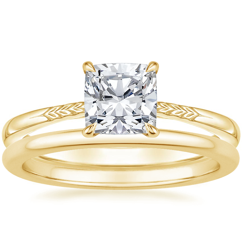 18K Yellow Gold Laurel Engraved Ring with Petite Comfort Fit Wedding Ring