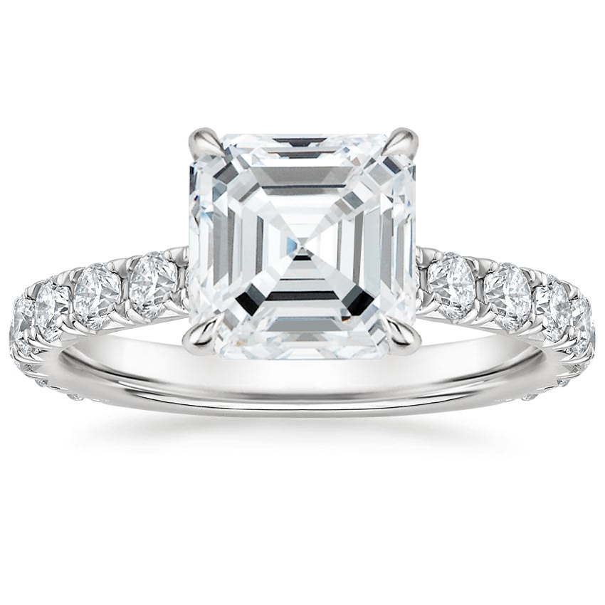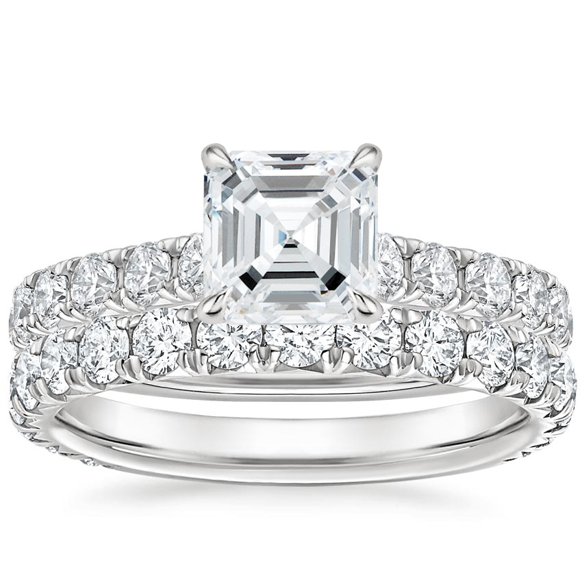 This luminous bridal set secures the center gem with elegant claw prongs and features glamorous French pavé diamonds, a setting style that allows light to reach the diamonds from multiple angles, enhancing their sparkle.