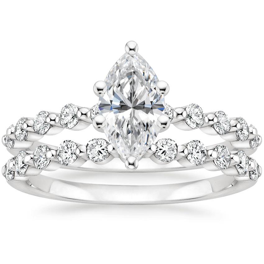 Floating shared prong diamond bands pair effortlessly and elevate the center gem in this light and lustrous bridal set. ... Read More