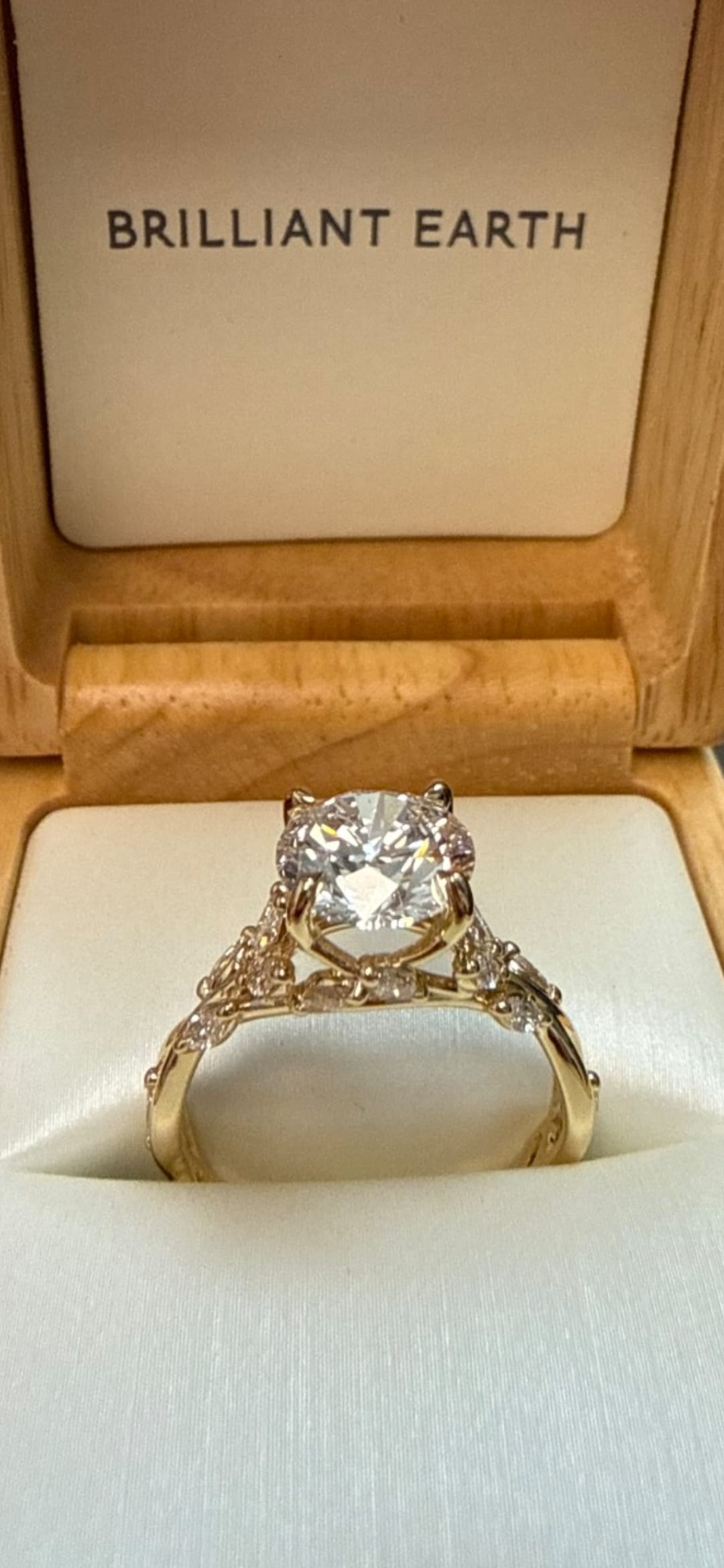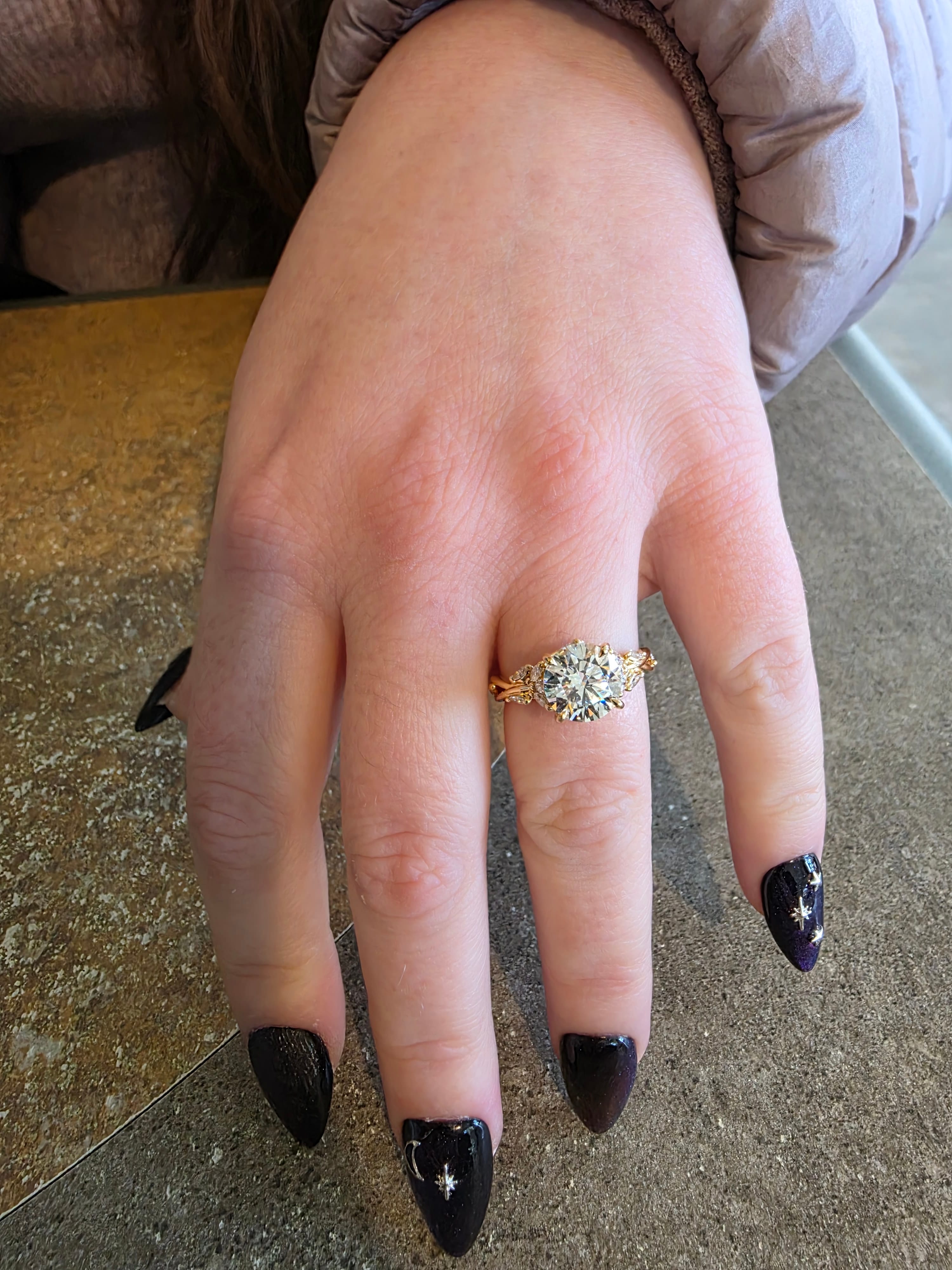 This ring is the most unique, beautiful ring I've ever seen. The details are intricate and mesmerizing--the leaf diamonds are placed in a subtle, yet elegant way. I am in love with everything about this ring! The center diamond is high quality and shines. I love that on the website, you can research so much before choosing the right fit. Visiting the SF showroom to see Kelly was enjoyable, personal and informative. She followed up after and helped us make sure we got the perfect diamond. Everyone I've spoken to with BE has been kind and helpful! The ordering process was easy and the delivery was safe and fast. We are very happy with our choice! The ring is white gold and the lab diamond is 1.38 carats, F color and VS1. Ring size is 6.75 for reference.