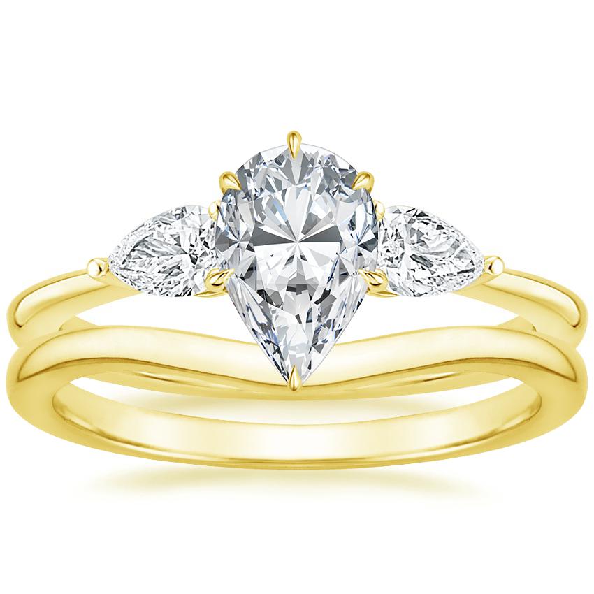 18K Yellow Gold Opera Diamond Ring with Petite Curved Wedding Ring