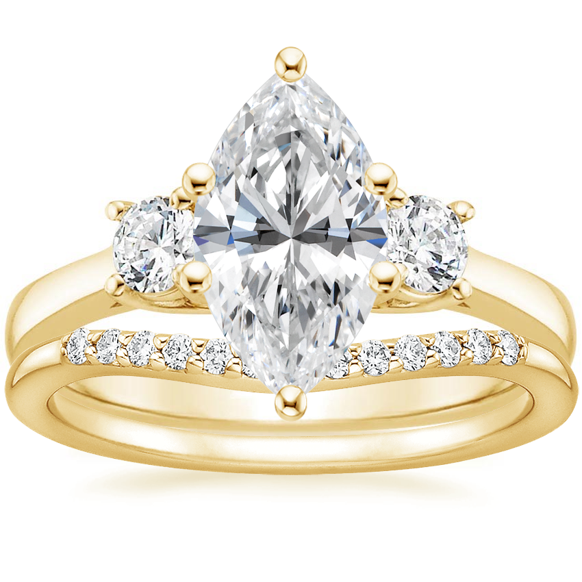 18K Yellow Gold Petite Three Stone Trellis Diamond Ring (1/3 ct. tw.) with Petite Curved Diamond Ring (1/10 ct. tw.)