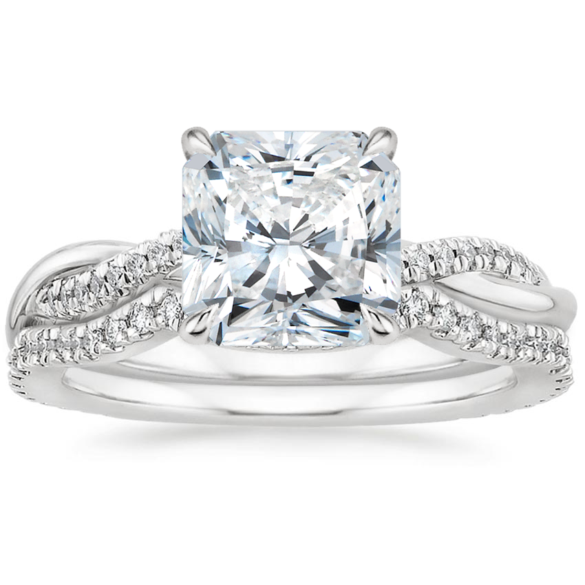 Ribbons of pavé-set diamonds and high polished precious metal weave together in this nature-inspired design. A diamond embellished wedding band contours to the engagement ring for a perfect fit. ... Read More