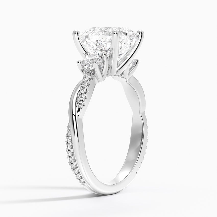My fiancé and I went to the Hollywood showcase to look at engagement ring options and she liked this and the traditional three stone design. I picked the twisted vine three stone in platinum because of its unique design. She was extremely happy with how pretty the ring is! My only real concern with the longevity of the design is the small pavé stones in the twisted vine. These are covered by the protection plan, but I won't be surprised if a few fall out from day to day contact of the ring with hard surfaces. Besides that minor drawback, I couldn't be happier with the entire process from initial contact to final product!