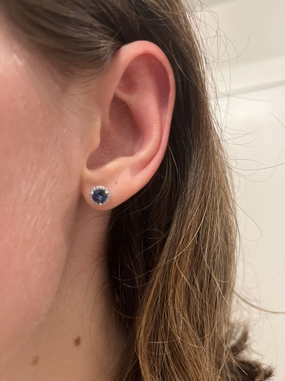 I bought these for my wife on our 5 year anniversary. I have only seen them on the website as I was in a hurry, but they just looked exquisite on the website.... When I picked it up, to my surprise they weren't as bright blue as depicted on the website. At a glance it looks closer to a deep dark navy blue rather than a lighter sapphire. On my particular one, its so dark you couldn't see any depth in it unless its a super bright light on it.... ...Read More