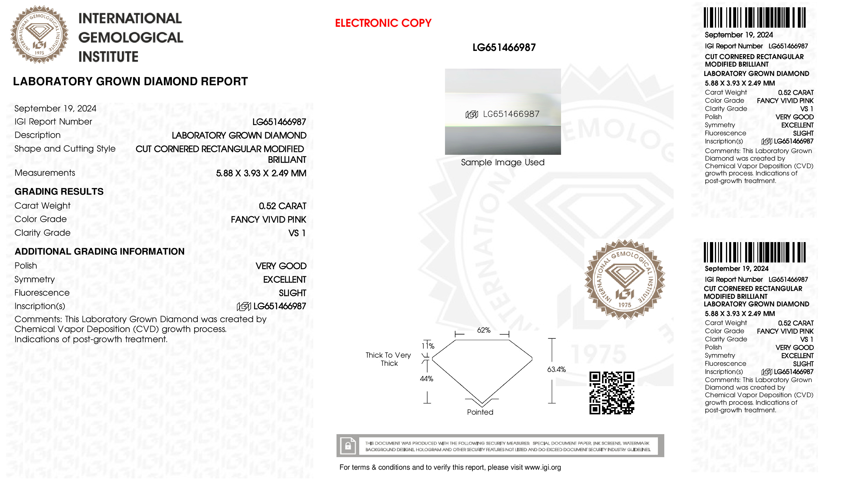 This Certified 0.52 Carat 5.88 x 3.93 x 2.49 mm Pink Radiant Lab Grown Diamond has been hand selected by our GIA-certified gemologists for its exceptional characteristics and rarity.