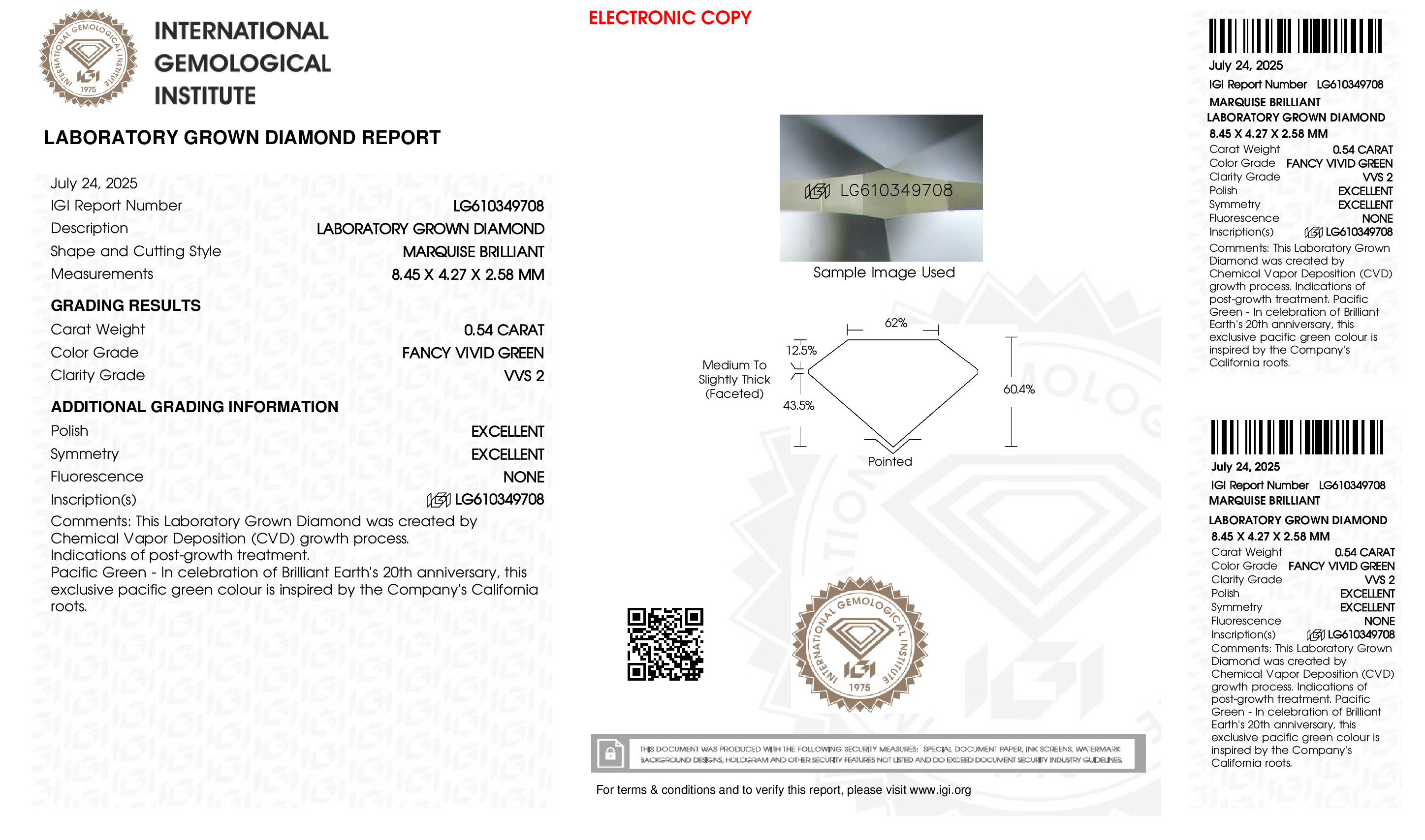 This Certified 0.54 Carat 8.45 x 4.27 x 2.58 mm Green Marquise Lab Grown Diamond has been hand selected by our GIA-certified gemologists for its exceptional characteristics and rarity.