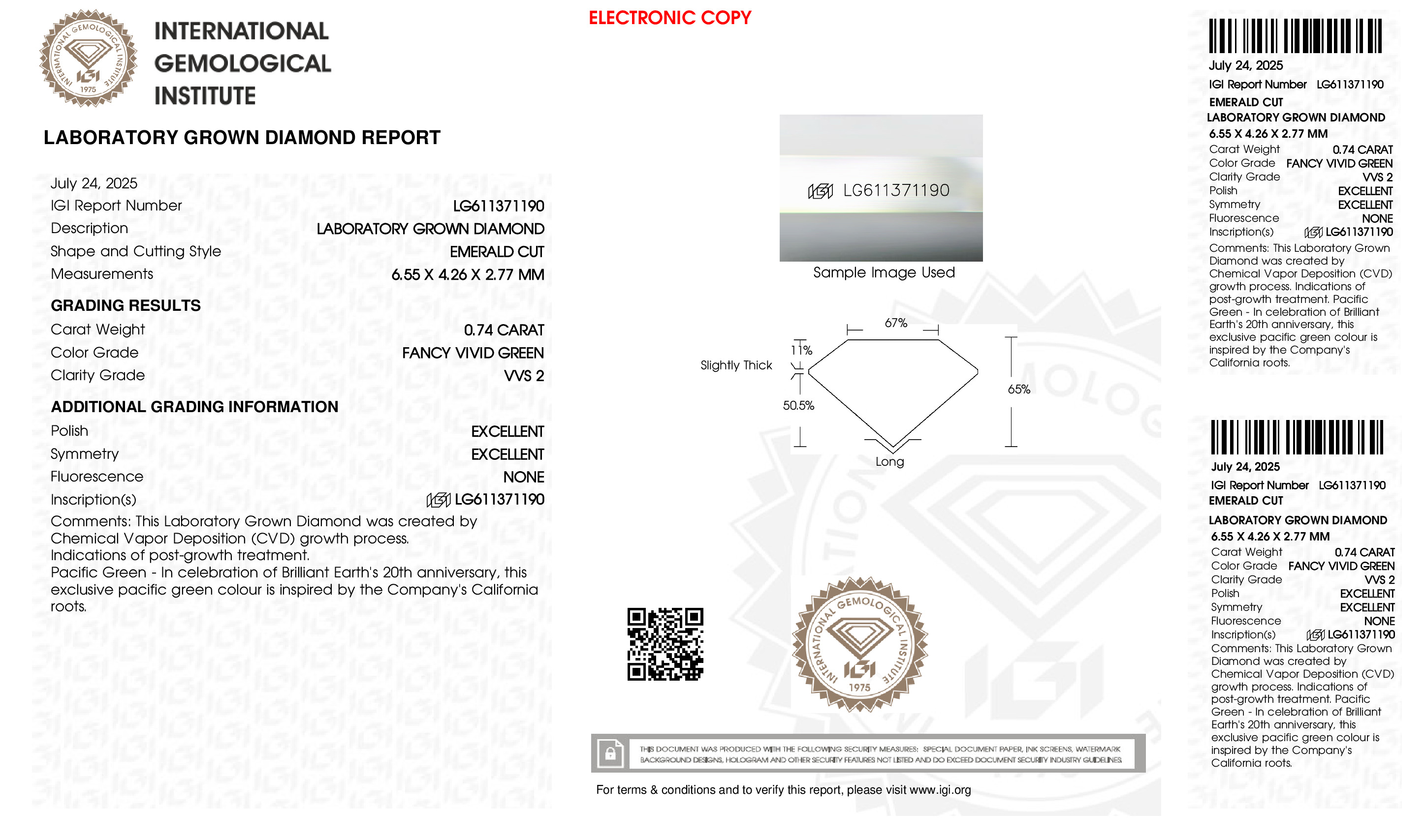 This Certified 0.74 Carat 6.55 x 4.26 x 2.77 mm Green Emerald Lab Grown Diamond has been hand selected by our GIA-certified gemologists for its exceptional characteristics and rarity.