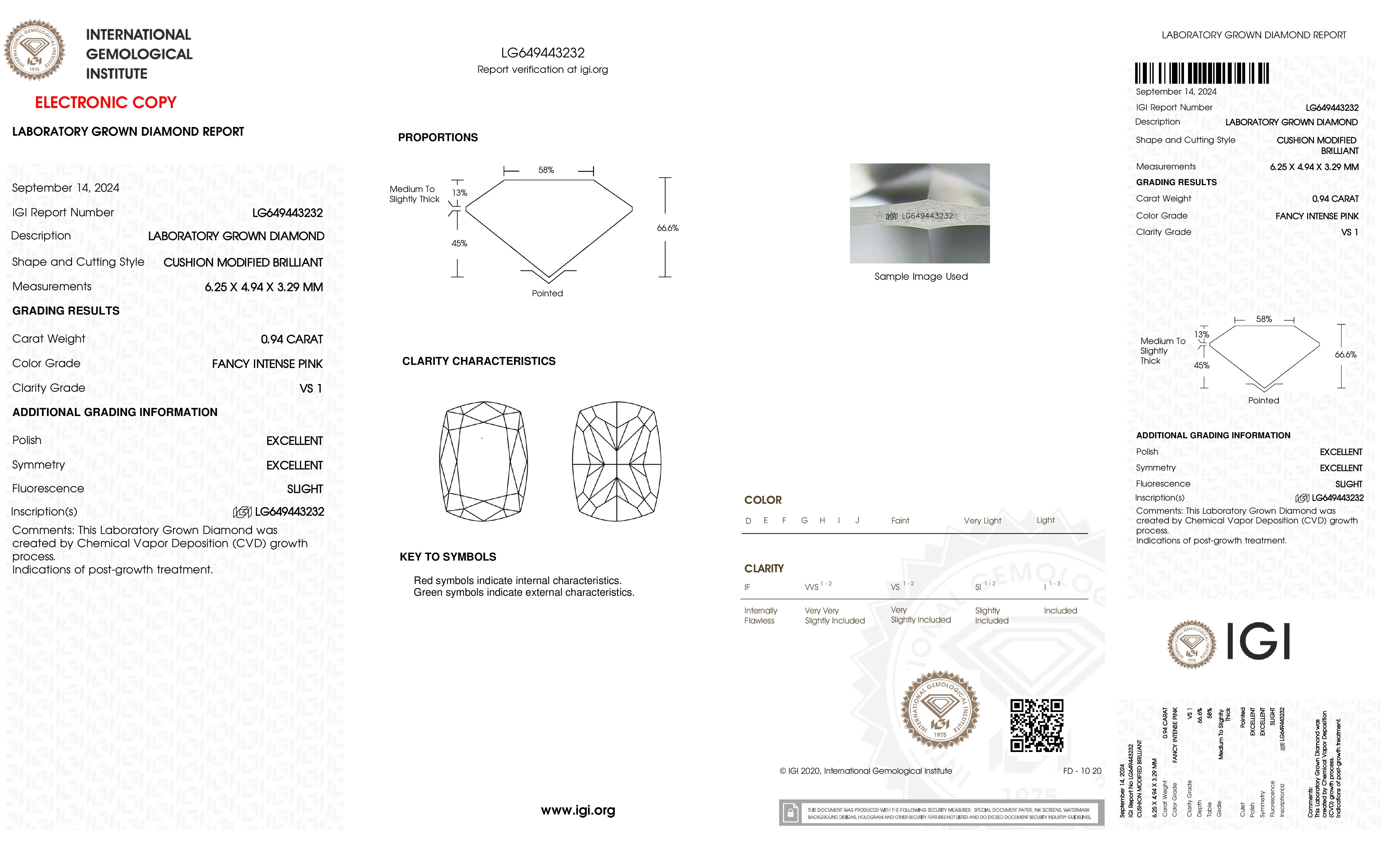 This Certified 0.94 Carat 6.25 x 4.94 x 3.29 mm Pink Cushion Lab Grown Diamond has been hand selected by our GIA-certified gemologists for its exceptional characteristics and rarity.