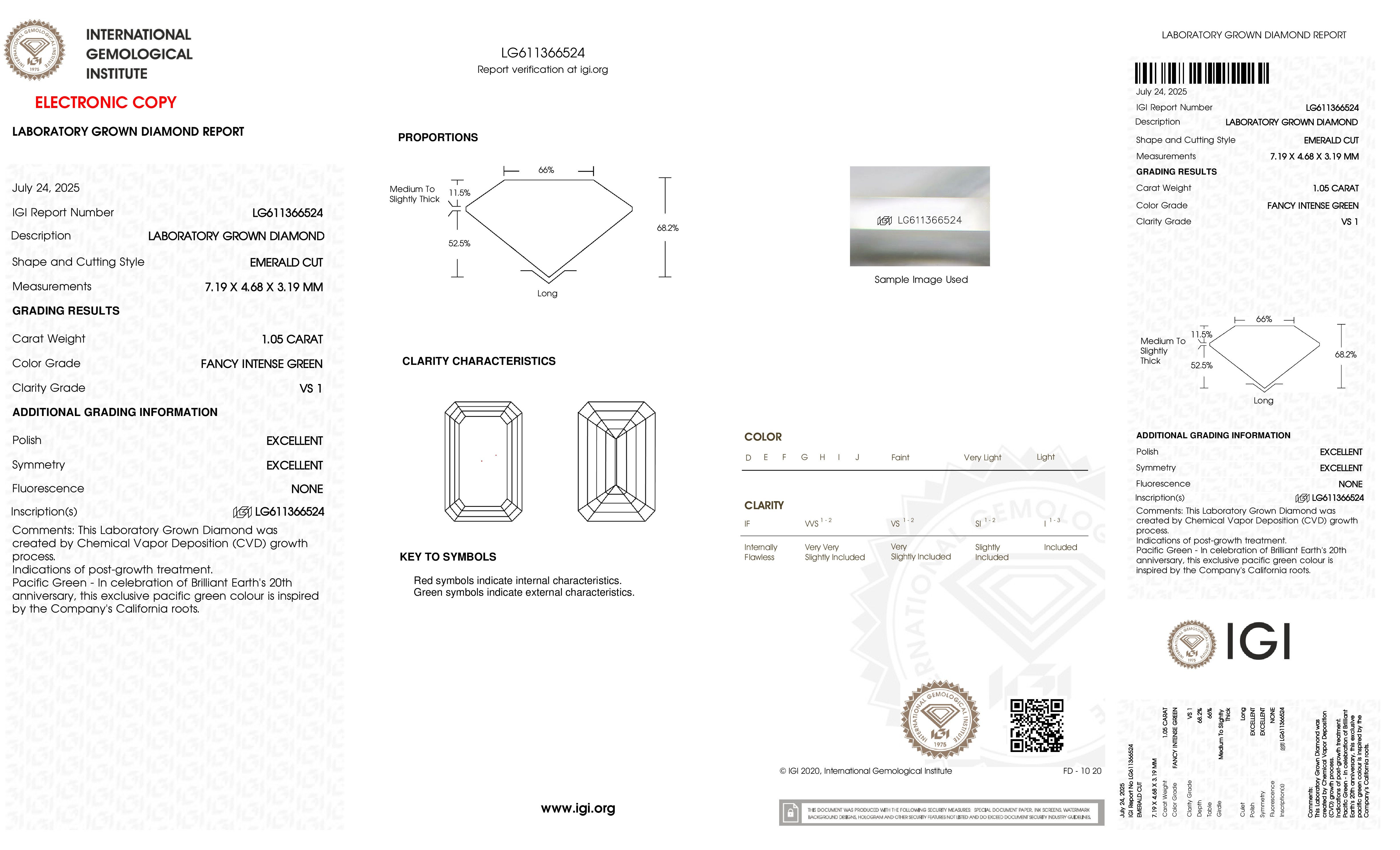 This Certified 1.05 Carat 7.19 x 4.68 x 3.19 mm Green Emerald Lab Grown Diamond has been hand selected by our GIA-certified gemologists for its exceptional characteristics and rarity.