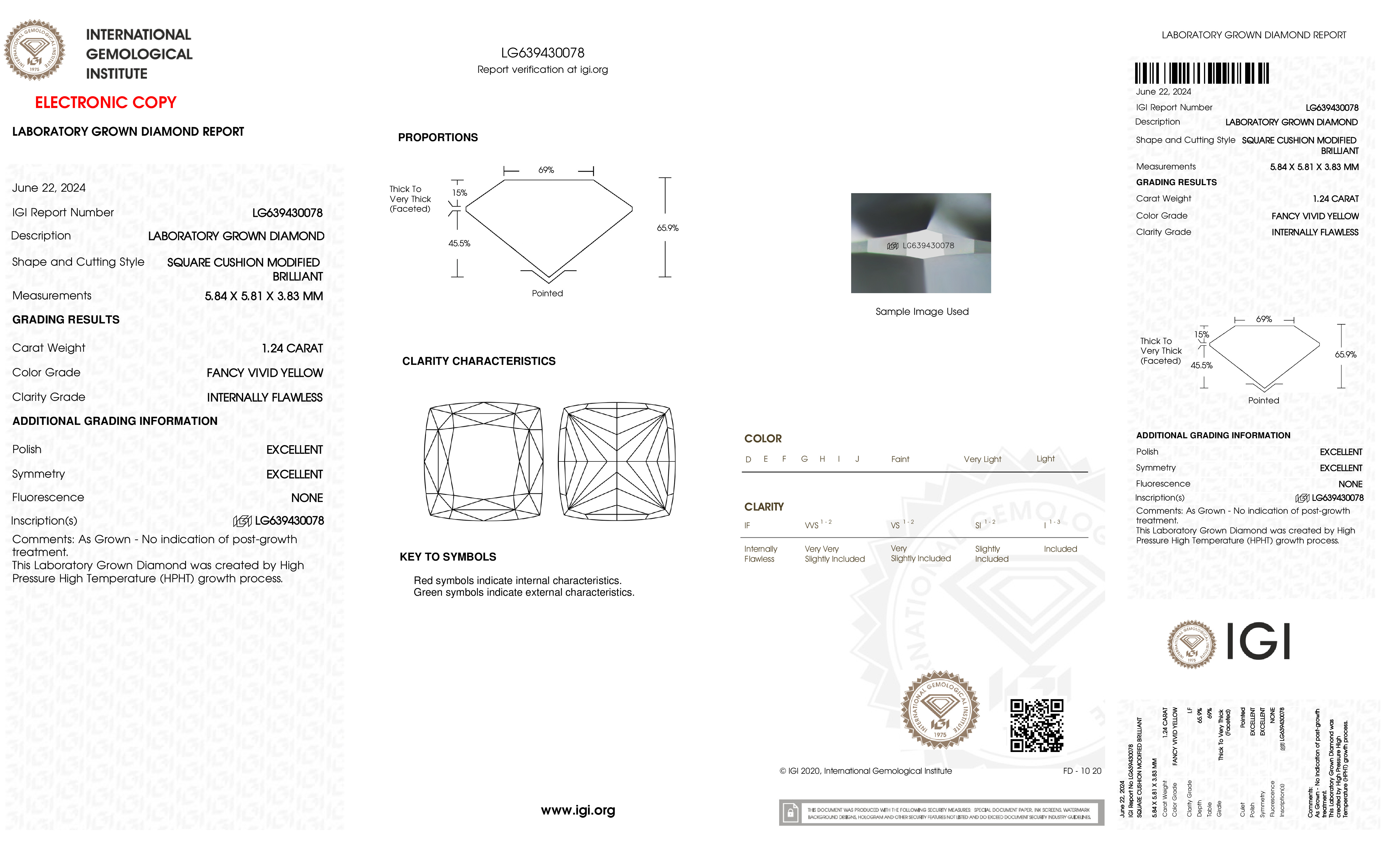 This Certified 1.24 Carat 5.84 x 5.81 x 3.83 mm Yellow Cushion Lab Grown Diamond has been hand selected by our GIA-certified gemologists for its exceptional characteristics and rarity.