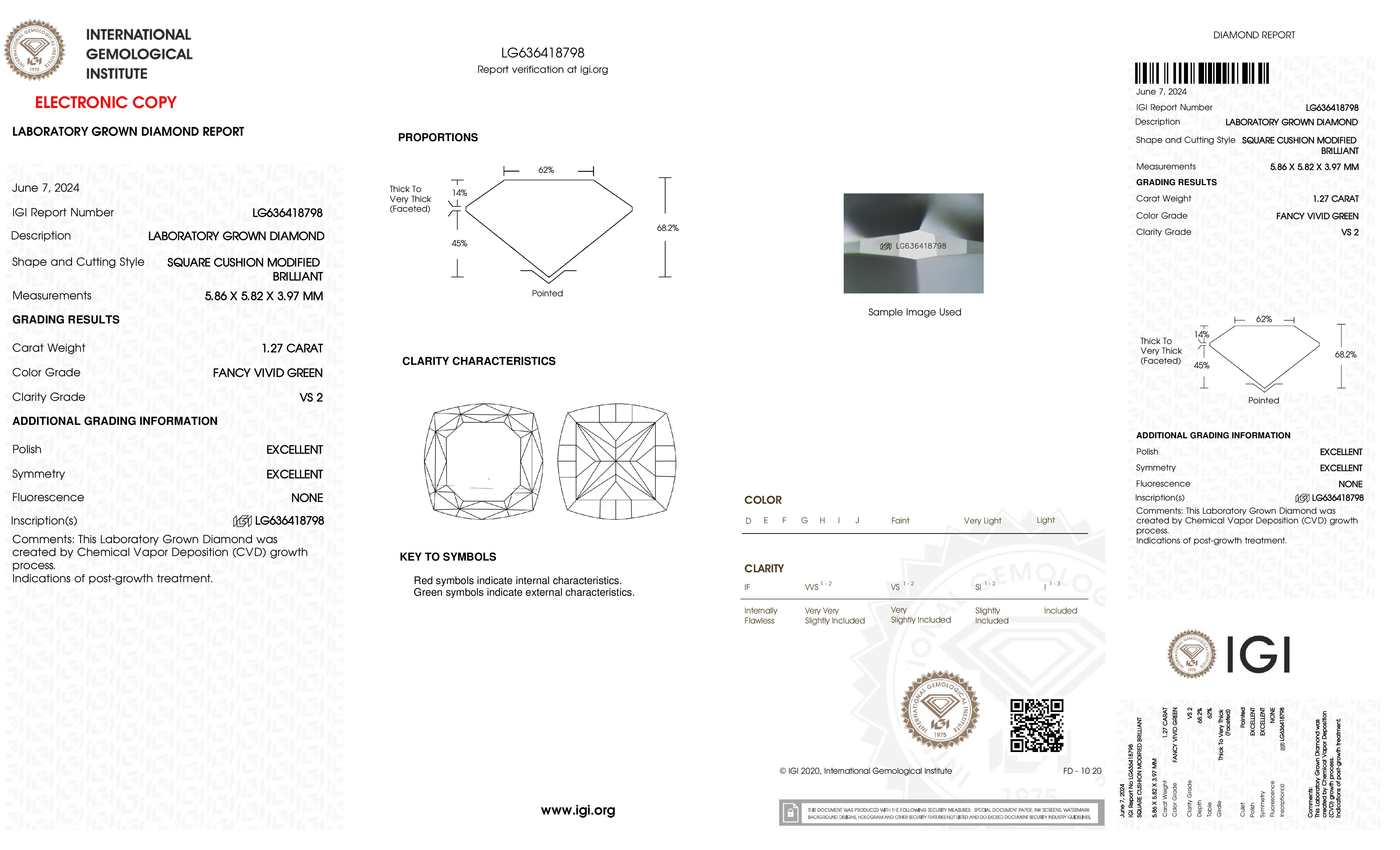 This Certified 1.27 Carat 5.86 x 5.82 x 3.97 mm Green Cushion Lab Grown Diamond has been hand selected by our GIA-certified gemologists for its exceptional characteristics and rarity.