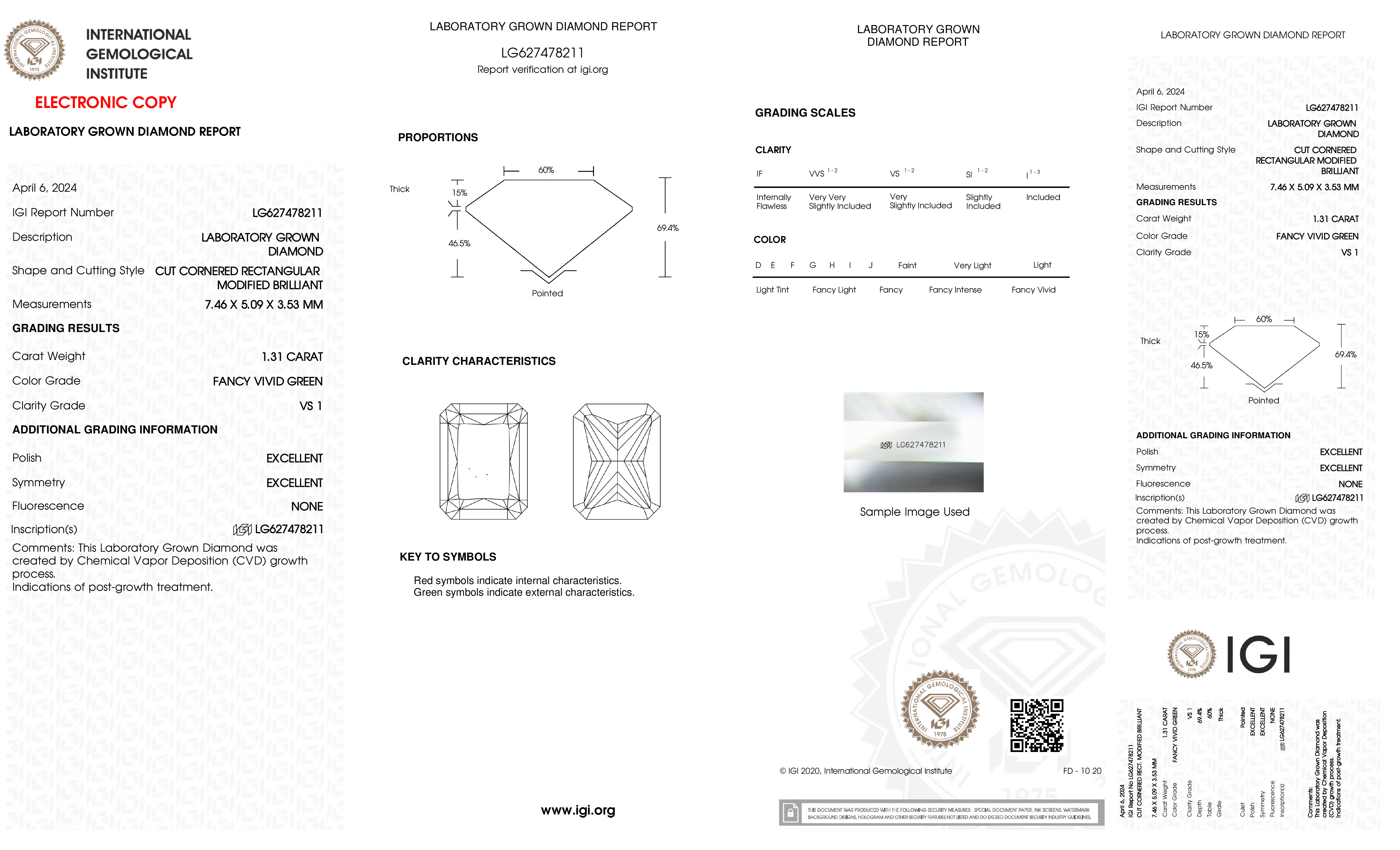 This Certified 1.31 Carat 7.46 x 5.09 x 3.53 mm Green Radiant Lab Grown Diamond has been hand selected by our GIA-certified gemologists for its exceptional characteristics and rarity.