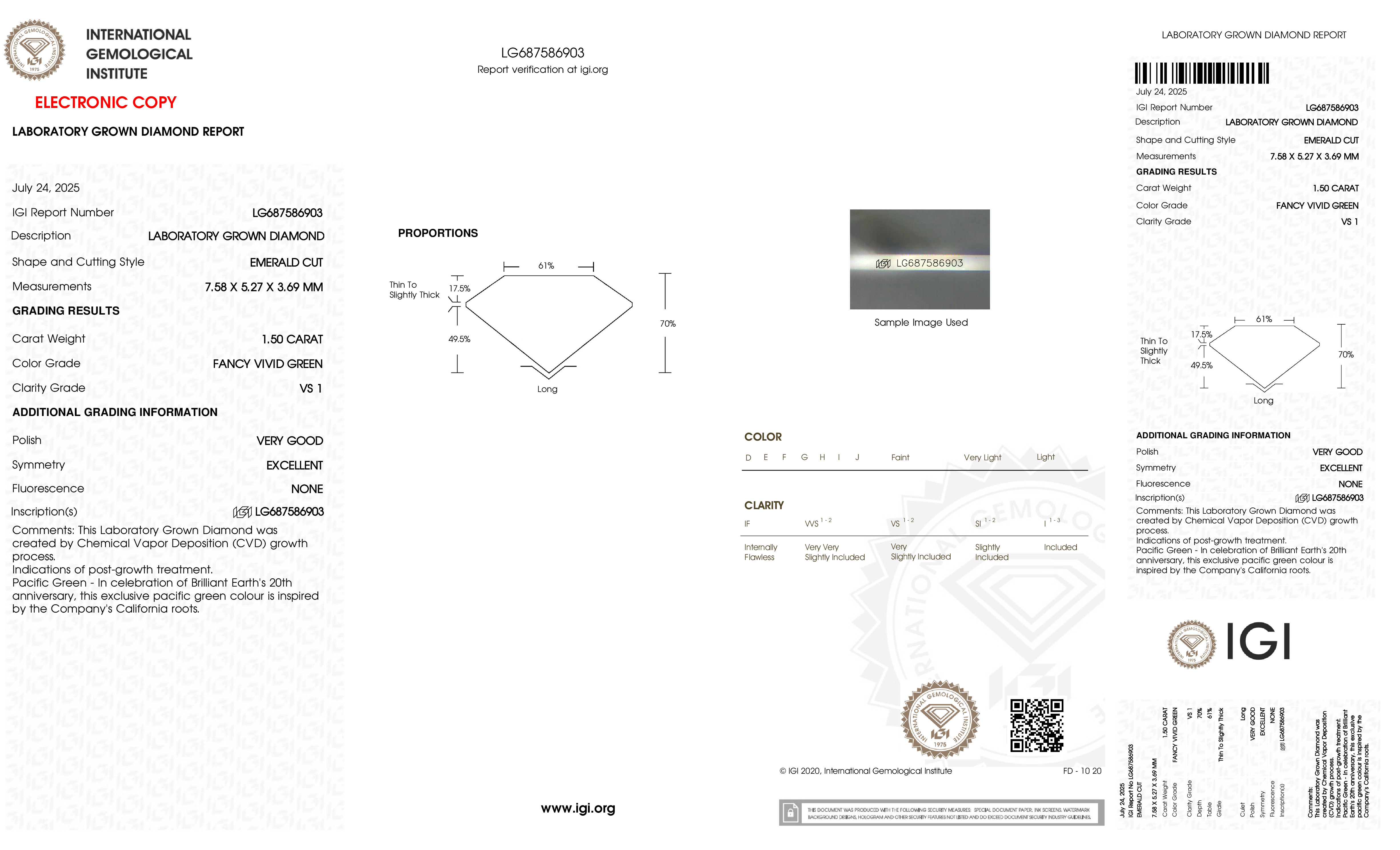 This Certified 1.5 Carat 7.58 x 5.27 x 3.69 mm Green Emerald Lab Grown Diamond has been hand selected by our GIA-certified gemologists for its exceptional characteristics and rarity.