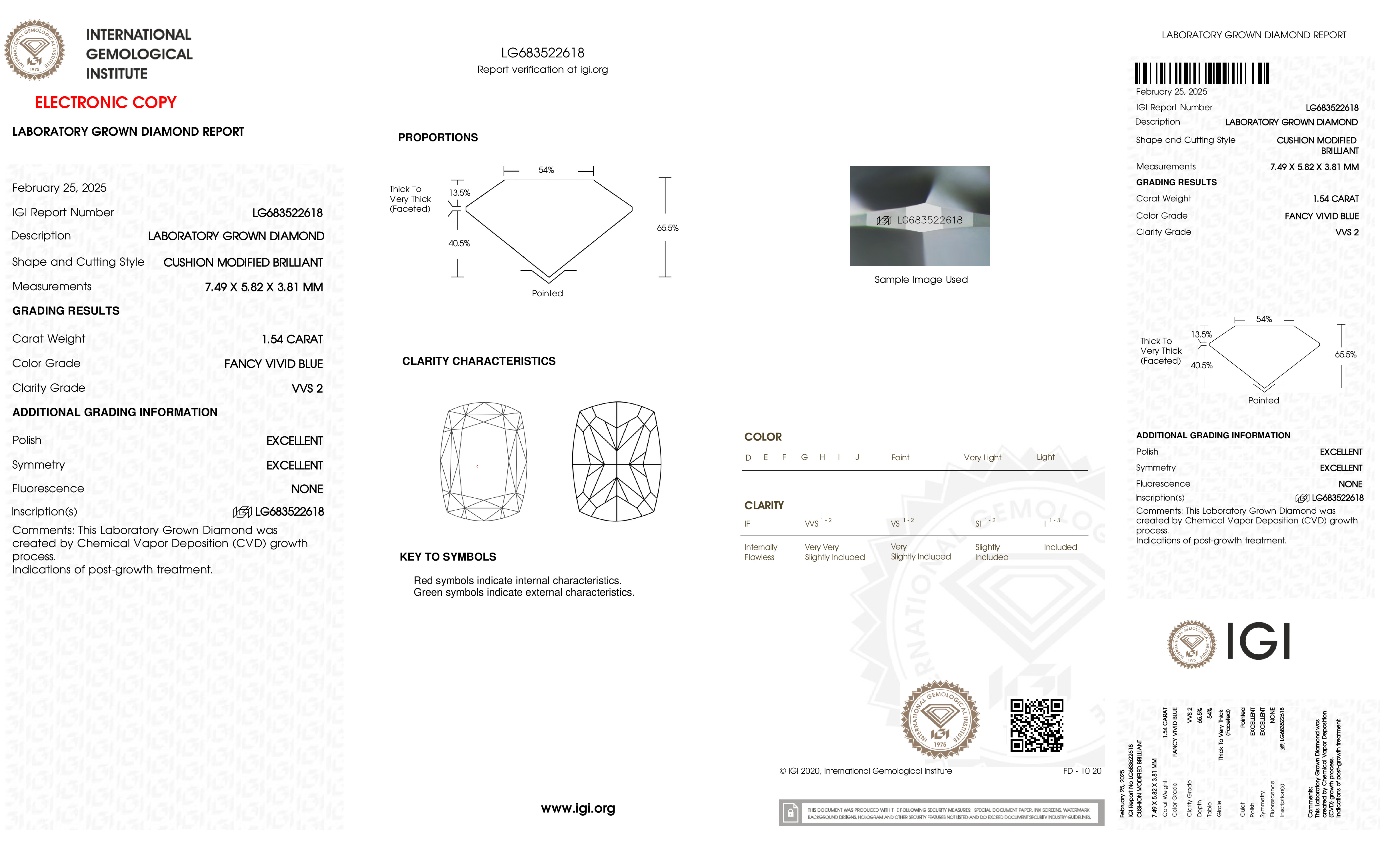 This Certified 1.54 Carat 7.49 x 5.82 x 3.81 mm Blue Cushion Lab Grown Diamond has been hand selected by our GIA-certified gemologists for its exceptional characteristics and rarity.