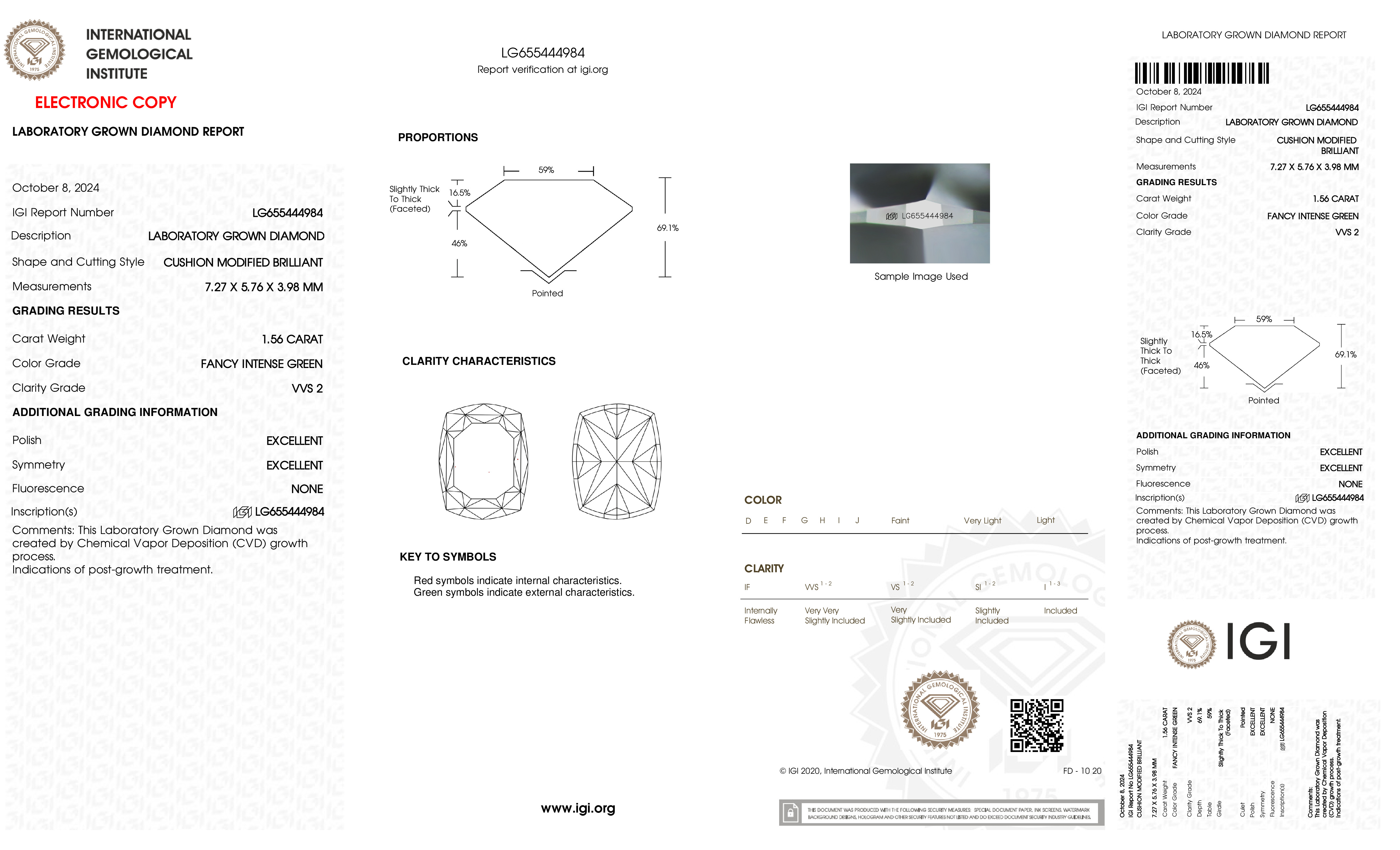 This Certified 1.56 Carat 7.27 x 5.76 x 3.98 mm Green Cushion Lab Grown Diamond has been hand selected by our GIA-certified gemologists for its exceptional characteristics and rarity.