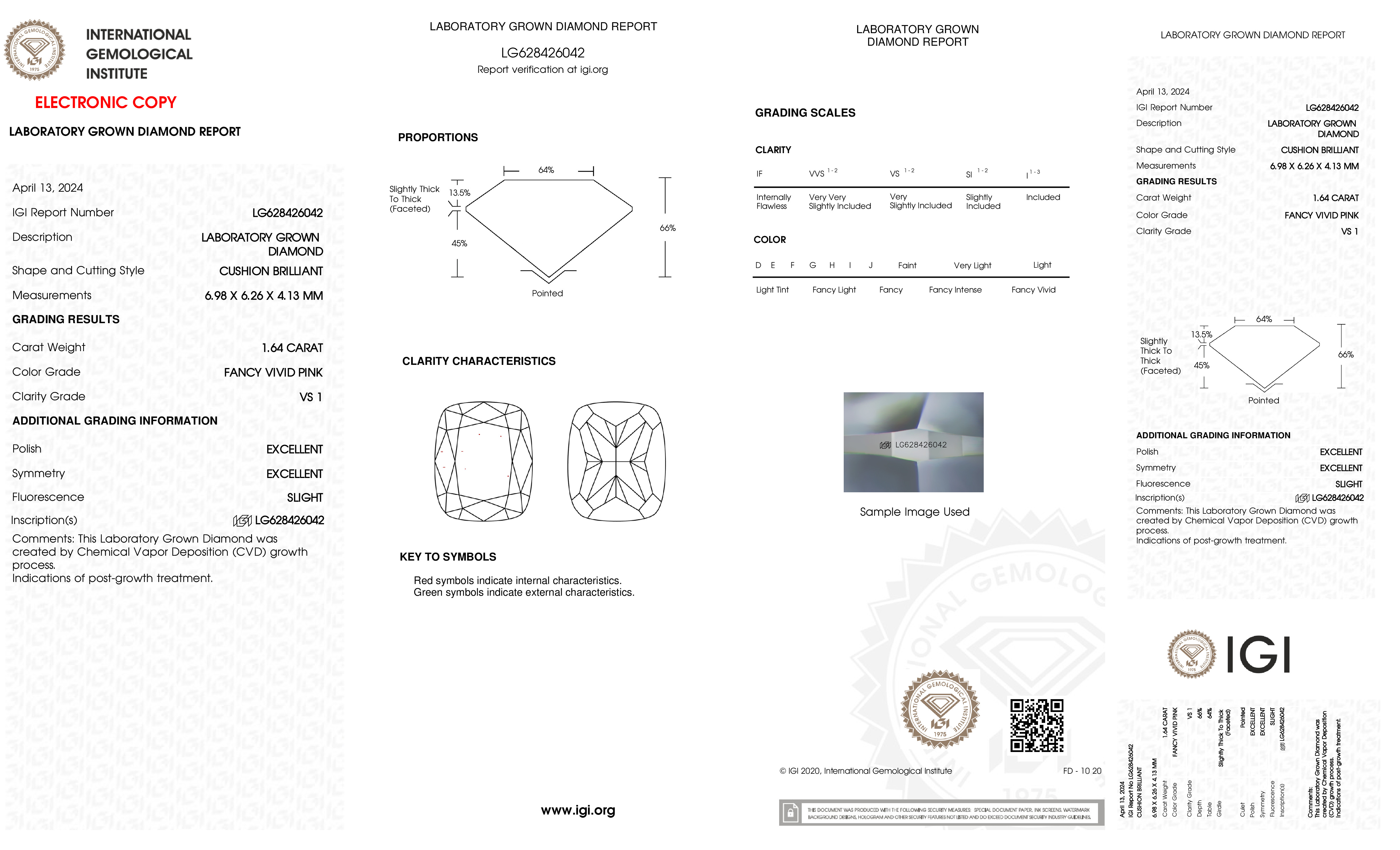 This Certified 1.64 Carat 6.98 x 6.26 x 4.13 mm Pink Cushion Lab Grown Diamond has been hand selected by our GIA-certified gemologists for its exceptional characteristics and rarity.