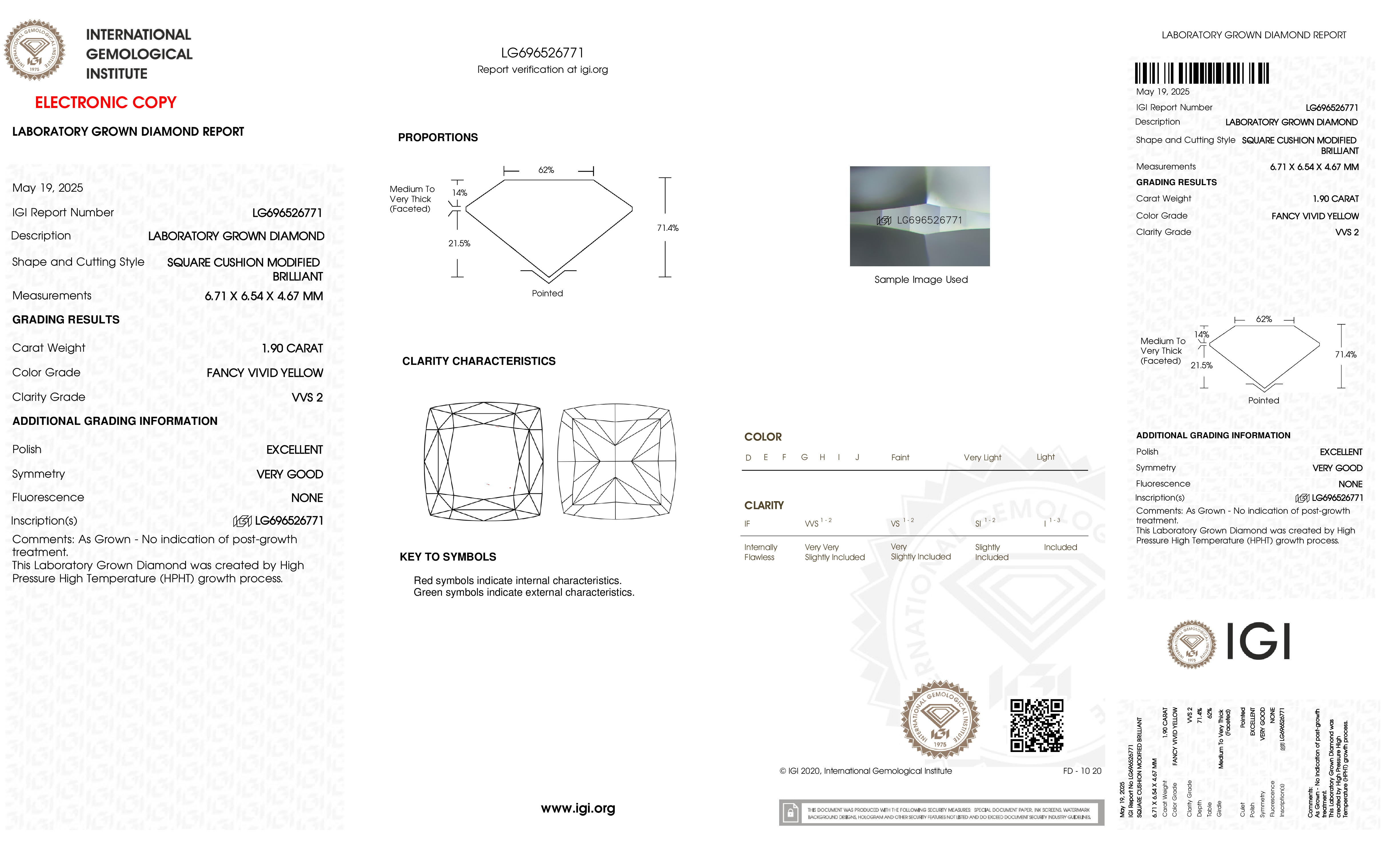 This Certified 1.90 Carat 6.71 x 6.54 x 4.67 mm Yellow Cushion Lab Grown Diamond has been hand selected by our GIA-certified gemologists for its exceptional characteristics and rarity.