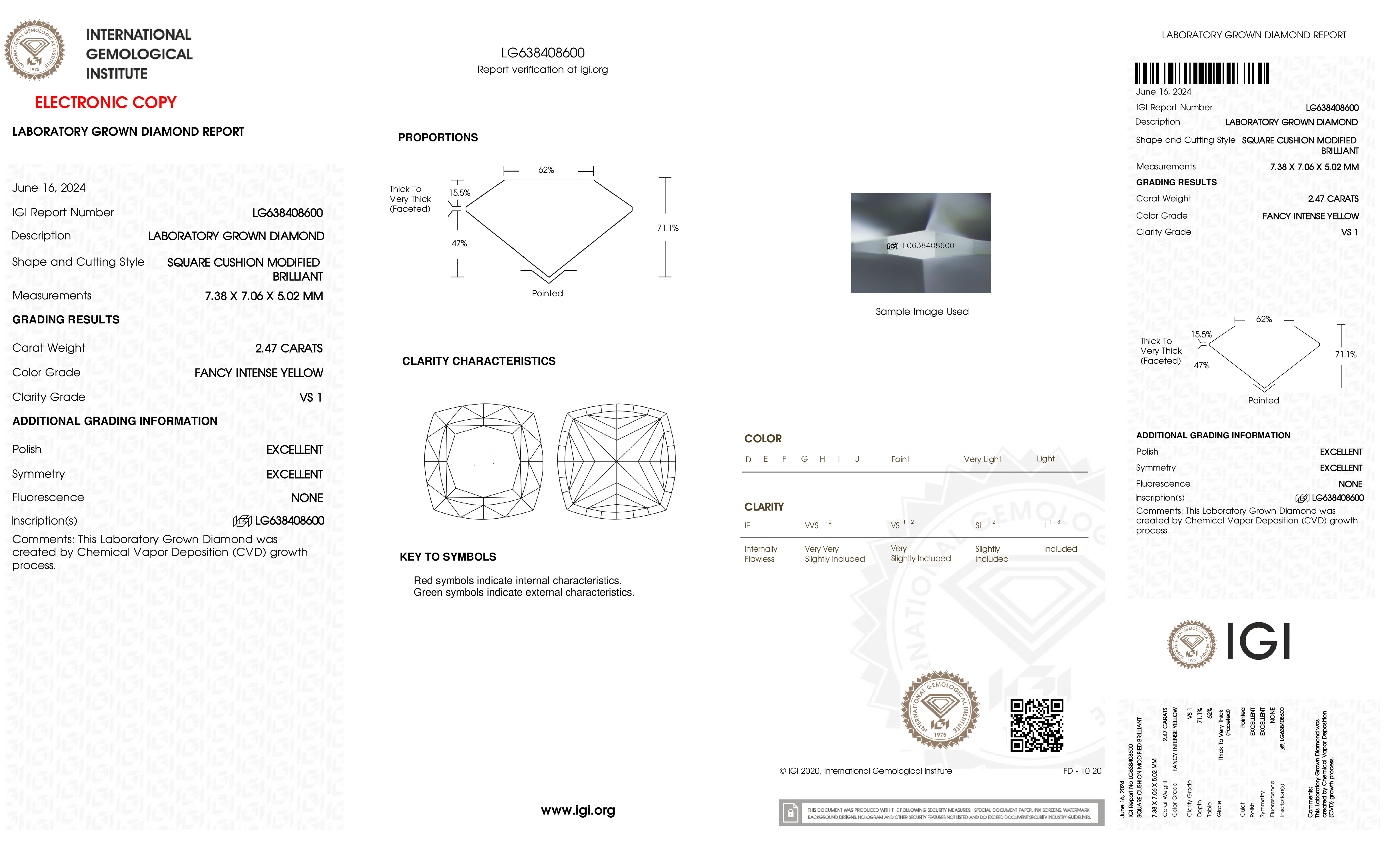 This Certified 2.47 Carat 7.38 x 7.06 x 5.02 mm Yellow Cushion Lab Grown Diamond has been hand selected by our GIA-certified gemologists for its exceptional characteristics and rarity.