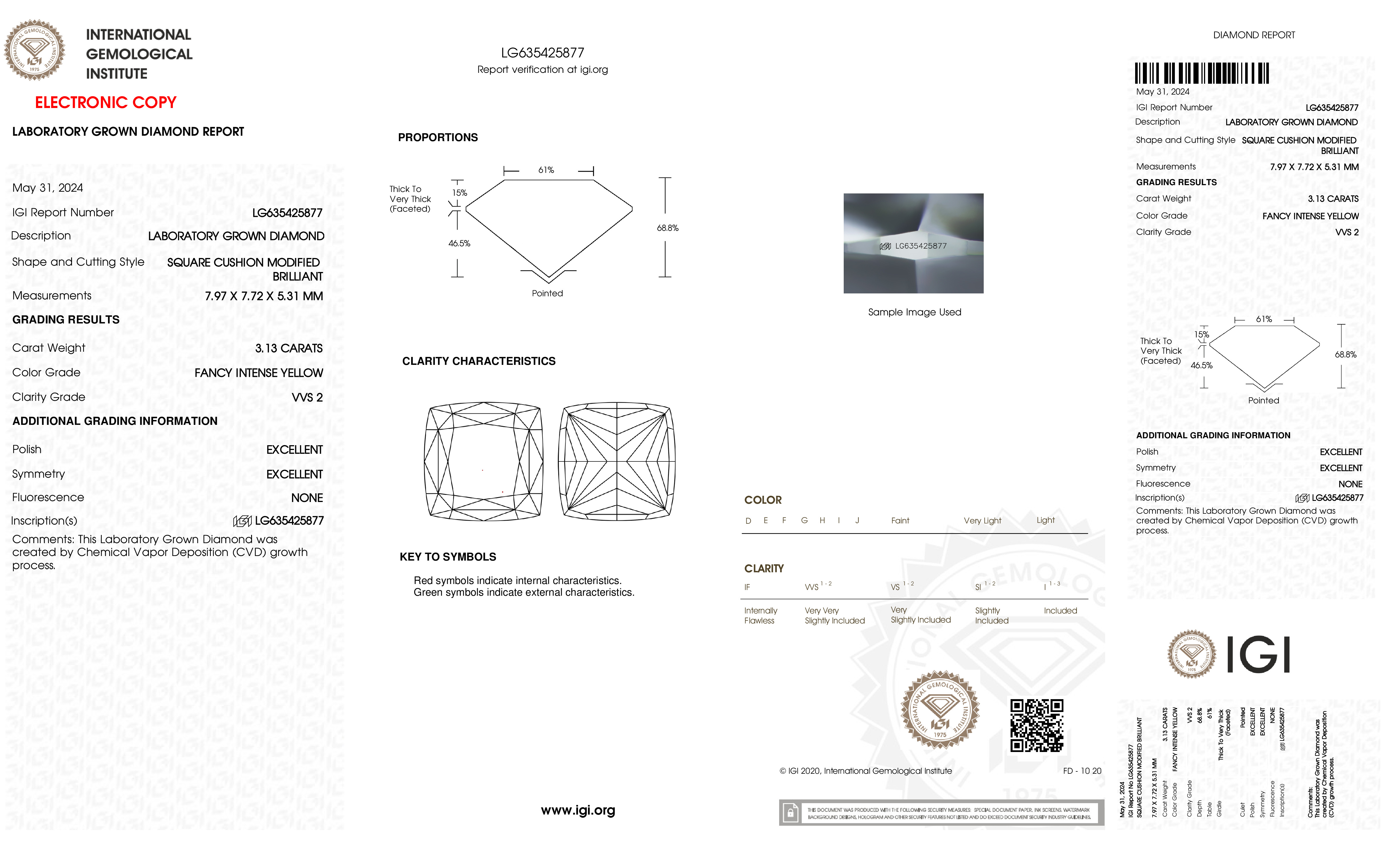 This Certified 3.13 Carat 7.97 x 7.72 x 5.31 mm Yellow Cushion Lab Grown Diamond has been hand selected by our GIA-certified gemologists for its exceptional characteristics and rarity.