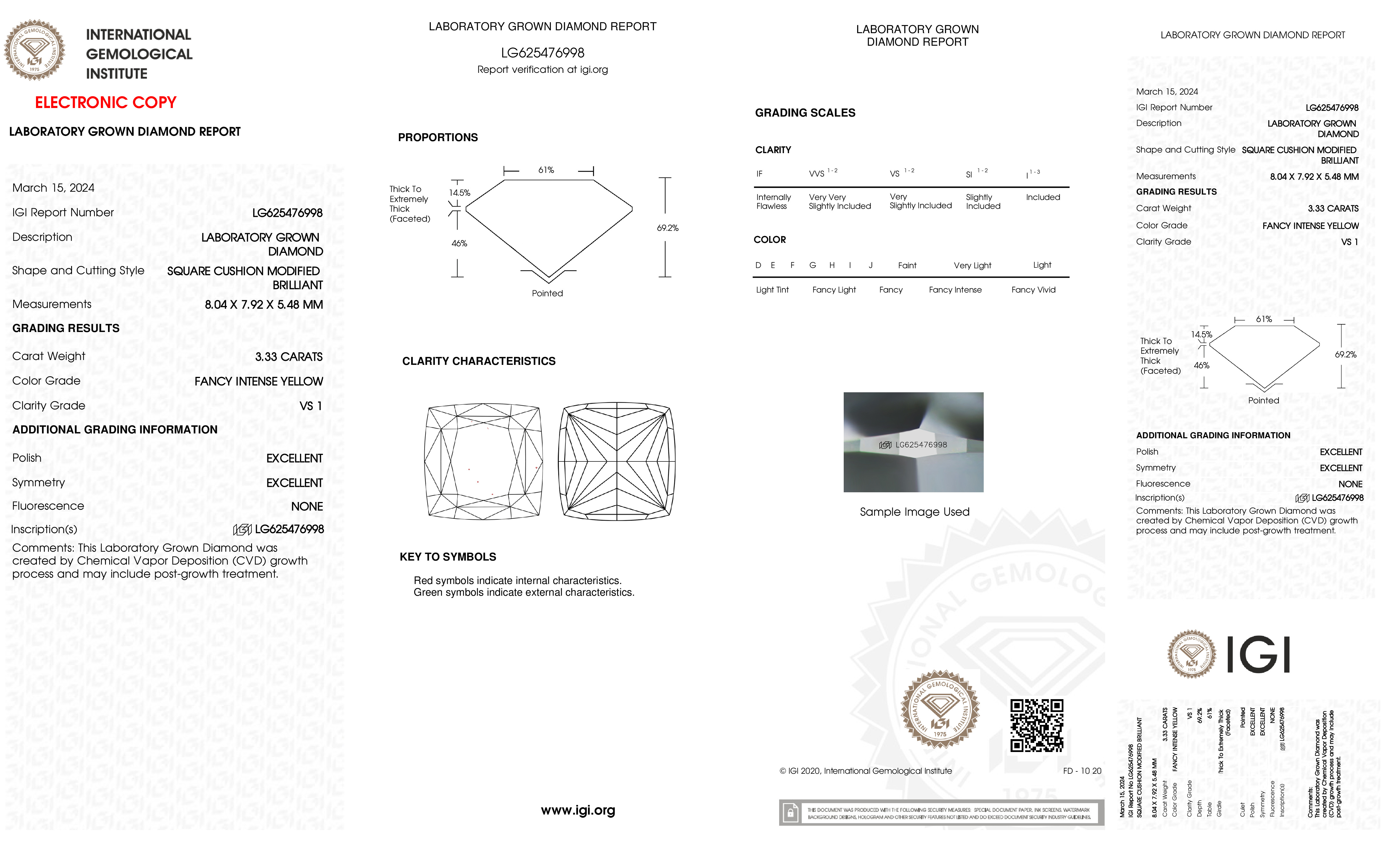 This Certified 3.33 Carat 8.04 x 7.92 x 5.48 mm Yellow Cushion Lab Grown Diamond has been hand selected by our GIA-certified gemologists for its exceptional characteristics and rarity.