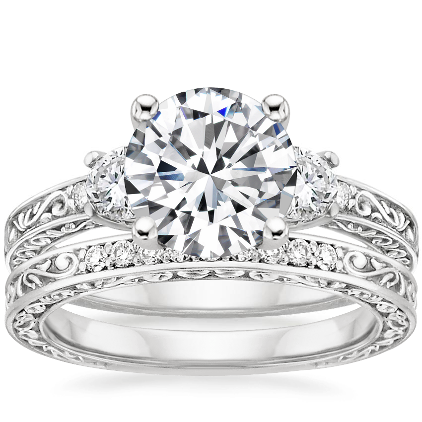 Platinum Antique Scroll Three Stone Trellis Diamond Ring (1/3 ct. tw.) with Delicate Antique Scroll Diamond Ring (1/15 ct. tw.)