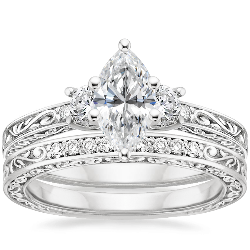 18K White Gold Antique Scroll Three Stone Trellis Diamond Ring (1/3 ct. tw.) with Delicate Antique Scroll Diamond Ring (1/15 ct. tw.)