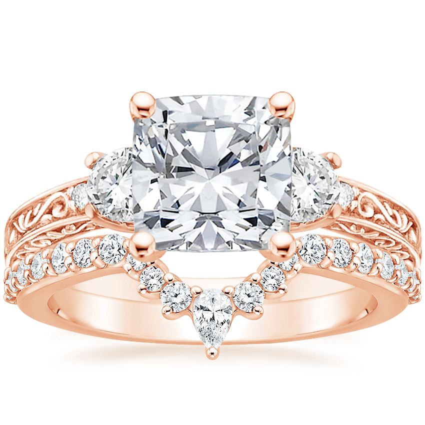 14K Rose Gold Antique Scroll Three Stone Trellis Diamond Ring (1/3 ct. tw.) with Luxe Lunette Diamond Ring (1/3 ct. tw.)