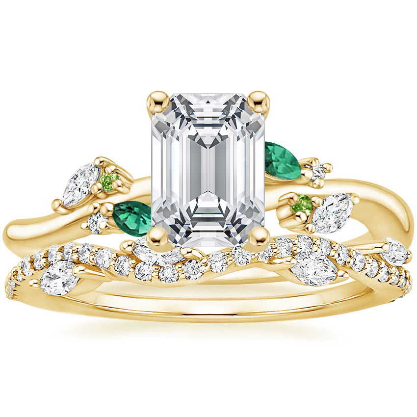 18K Yellow Gold Arden Diamond Ring with Lab Emerald Accents with Luxe Winding Willow Diamond Ring (1/4 ct. tw.)