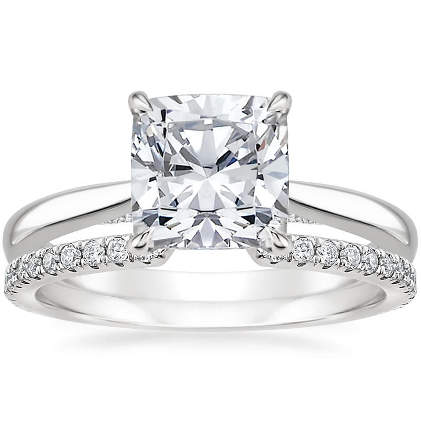 My partner and I picked this ring out and I am so glad we did! We ordered online which was nerve-racking, but we both love the finished product. I love the hidden accents on the ring and I love the thinner band. I would recommend Brilliant Earth and this specific ring to anyone! We ordered a 1.07 carat cushion cut ring for reference. The wedding band is the Brilliant Earth luxe ballad band.