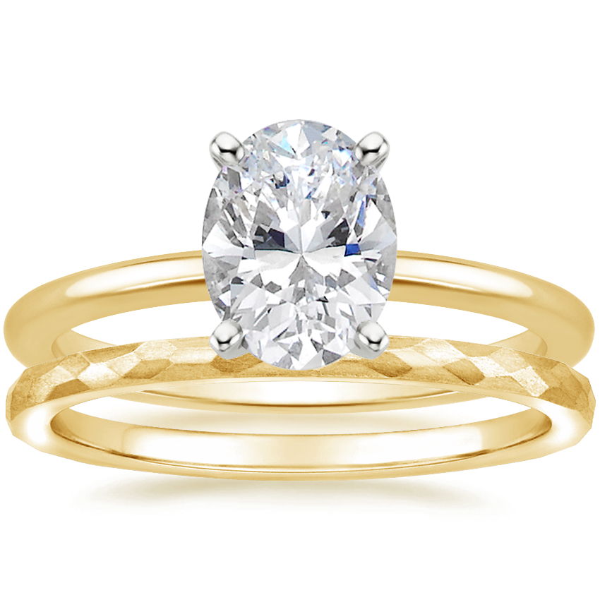 18K Yellow Gold Four-Prong Petite Comfort Fit Ring with Matte Hammered Petite Comfort Fit Wedding Ring