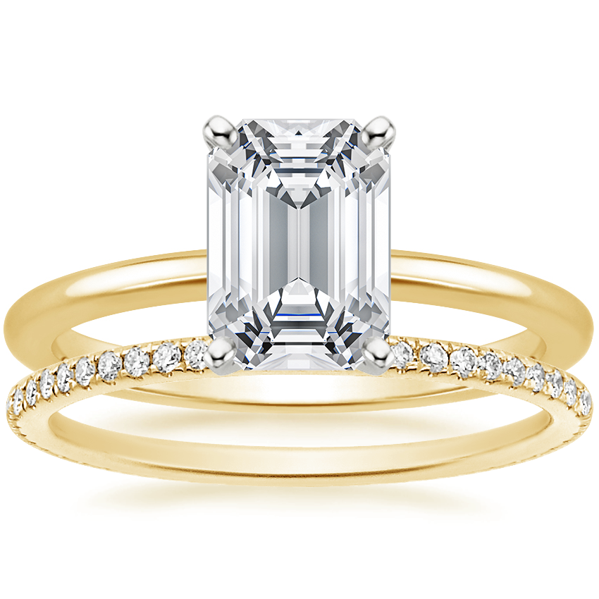 A four-prong solitaire ring and an sleek eternity diamond band are a delicate but powerful duo in this petite and romantic bridal set (1/4 total carat weight). ... Read More