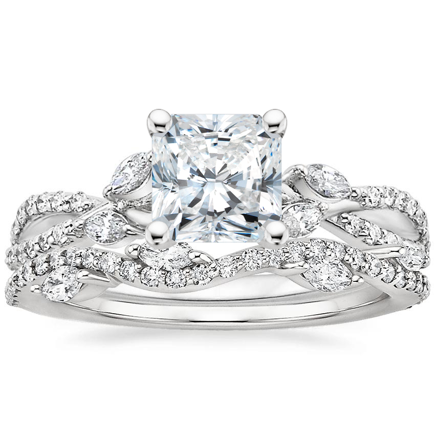 This beautiful bridal set features delicate vines adorned with sparkling round diamonds and marquise diamond buds that reach for the center gem. The perfect combination of natural elegance and breathtaking sparkle, this set will delight nature lovers everywhere. ... Read More