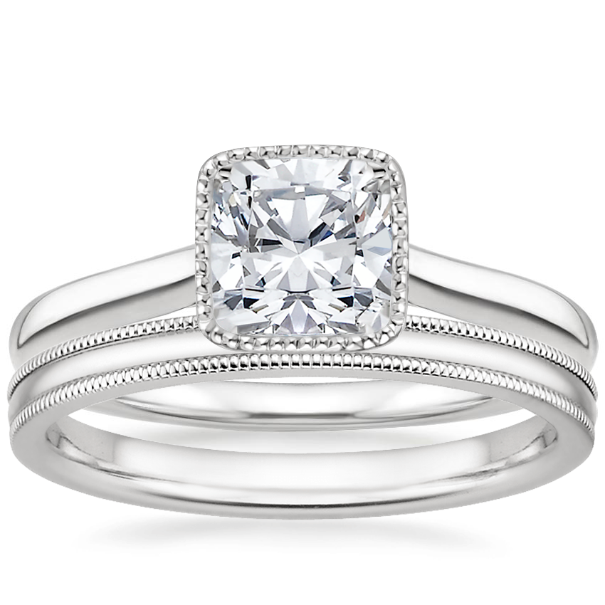 I chose this ring as my engagement ring because it's so special! The milgrain gives the ring such a vintage look. I love the clean look of the band. I had it customized to 14k yellow gold because I prefer the color a bit more. My ring is set with an 8mm round moissanite.
